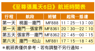 同日2 0 : 3 0 轉搭包機直飛張家界, 22:10抵達張家界,次日一早即可精神飽滿地探訪張家界仙境般的絕美景致。行程第五天搭乘晚班機22:45出發返回廈門,隔日17:15搭機返台前得以悠哉遊玩鼓浪嶼;由於回程自松山機場入境,18:45抵達後還有充足的時間休息。