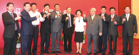 ▲ 蘇台旅遊合作研討會圓滿成功(左起)東方航空江蘇區副總經理羅來宏、江蘇省旅遊局長周乃翔、中國國家旅遊局副局長張希欽、江蘇省副省長張衛國、旅行公會總會理事長姚大光、江蘇省台辦主任陳堯、中華兩岸旅行協會理事長沈冠亞、省聯合會理事長黃瑞榮、品保協會理事長林進榮、高雄市旅行公會監事會主席黃金祥、高雄觀光協會理事長曾福興。