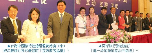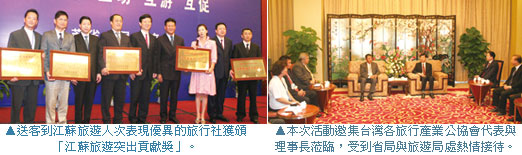 近年來,江蘇旅遊發展迅速,觀光基礎設施日趨完善,旅遊產業的規模亦不斷壯大,這裡炫目多采的自然風光和內蘊豐富的人文景觀交相輝映。長期以來,江蘇與台灣往來密切,從1987年台灣開放到大陸探親以來,統計至今年6月,江蘇省已經接待了台灣旅客總量達到874萬人次,登記註冊的台資產業公司更超過1萬家。長住江蘇的台灣與其家屬也超過3萬人,尤其7╱4以來,南京成為直航航點之一,更為兩岸旅業的互向發展,提供了最好的平台。