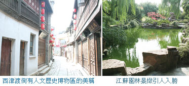 江蘇的崑曲已是聯合國核定的世界非物質文化遺產,台灣歌仔戲也有百年歷史;自然奇景之美方面,無錫的太湖與揚州的瘦西湖、南京的莫愁湖都是湖泊美景的一時之選,台灣高雄的澄清湖與南投的日月潭也是不遑多讓;水運河道之美方面,蘇州七里山塘與南通濠河的風光迷人,台灣高雄愛河與宜蘭的冬山河亦然一映多采;而提到宗教文化之美,常州的天寧禪寺與蘇州寒山寺都是肅穆莊嚴,台灣的中台禪寺與佛光山更是香火鼎盛;歷史古蹟的層面上,江蘇的南通博物院、中山陵讓人緬懷不已,台灣赤崁樓、億載金城、淡水小鎮、三峽老街同樣引人懷古思幽。