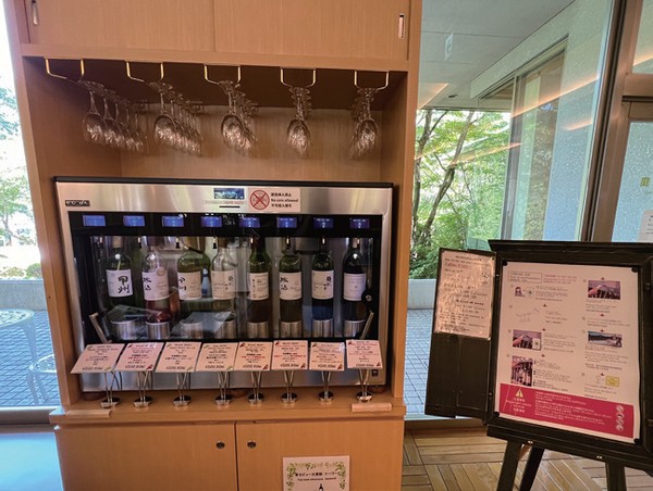 山梨縣為日本知名的葡萄酒產地,館內特設自助式葡萄酒販賣機,每杯500日圓,提供多款在地酒莊釀製的佳釀。旅客可依照喜好隨時小酌,搭配餐點更能完整體驗山梨「酒鄉」的魅力,成為入住時的另一大享受。
