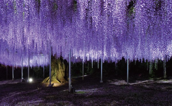 ▲夜晚燈光照射在紫藤花上非常美麗。