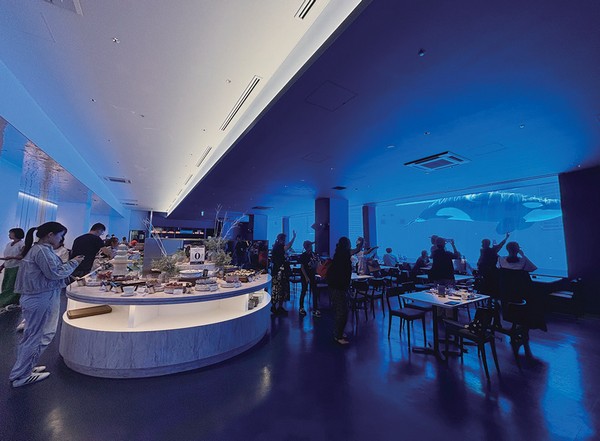 ▲虎鯨館自助餐廳「BLUE OCEAN」具備大型水槽,事前預約就有機會在虎鯨陪伴下享用美食。