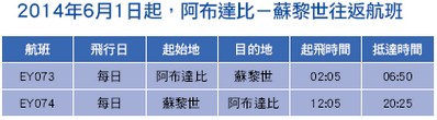 阿提哈德航空日前公佈,自2014年6月1號起,將新增阿拉伯聯合大公國首都阿布達比往返瑞士第一大城蘇黎世的每日航班。蘇黎世也將成為阿提哈德航空除了日內瓦以外,第2個在瑞士的航點,而新增的阿布達比往返航線將比目前提供的服務提供更有效率的轉機時間。