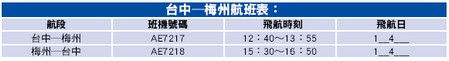 華信航空於12╱19由台中首航廣東省梅州市,成為兩岸第一家直航台灣到梅州的航空公司。每週一、四以E190機型執行飛航任務,座位數104 個,飛行時間為75分鐘。梅州市政府對梅州─台中航線相當重視,梅州市委常委黃偉聞特率領市政府領導搭乘華信航空班機由梅州首航台中,參加一系列航線推介活動。