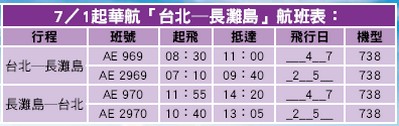 華航每週四、日可搭台北─長灘島航班,去程航班AE969早上8:30 出發,11:00抵達;回程航班AE970早上11:55出發,下午14:20返回台北。 7/1起因應暑期旺季,週二、五將新增去程AE2969與回程2970航班,每週共飛航4班,全程直飛不需轉機,旅客可享直飛與早去晚回的航班優勢。