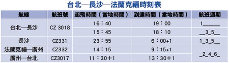 南航將於今年6月開通由廣州出發飛往法蘭克福的航線,中途經停長沙,每週執飛3班,台灣旅客可利用南航台北 ─長沙和廣州─台北直航班機,與其順暢銜接。廣州─長沙─法蘭克福航班號為CZ331╱332,每週往返3班。去程航班每週一、三、五,晚上23:55從長沙起飛,第2天早晨6:00到達法蘭克福;回程航班每週二、四、六,下午14:15從法蘭克福起飛,第2天早晨9:15到達廣州,中午11:30從廣州起飛,13:30到達台北(以上時間均為當地時間)。