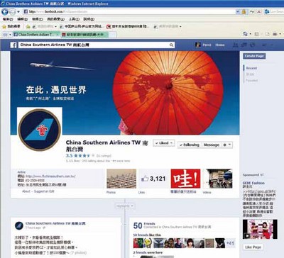 針對台灣消費者習性所推出的粉絲頁,每日分享航空資訊,以生活化的方式建立南航品牌形象,目前已有3,000多位粉絲。