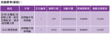 為回饋會員之長期支持,華航特別推出區域航線哩程兌換座艙升等商務艙優惠活動。活動期間:自2014年4╱ 7至2014年6╱ 30止。指定搭機日期:自2014年4╱ 7至2014年6╱ 30止(以搭機日為準)。適用航段:亞洲各航點之間 (不包含:松山往返羽田及松山往返上海/虹橋航線)