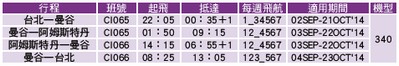 華航阿姆斯特丹航線,9/2起,CI065台北/曼谷/阿姆斯特丹取消週二航班, CI066阿姆斯特丹/曼谷/台北取消週三航班,時刻表如下: