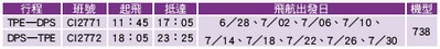 TPE-DPS-TPE暑假加班機時刻表