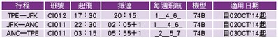 TPE-JFK-TPE班機時刻表