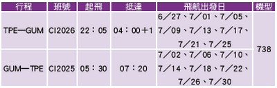 華航針對關島航線增飛暑假加班機,詳情請洽下列13家旅行社:康福/雄獅/東南/燦星/百威/五福/世邦/易遊網/易飛網/芬達/太平洋島/喜美/天海