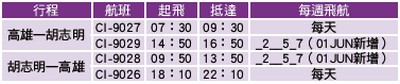 高雄—胡志明 6/1起增班服務