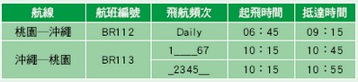 長榮航空桃園-沖繩航線以A321-200 天天飛航,總座位數為184個,包括8個商務艙座位及176 個經濟艙座位。為了慶祝新航線開航,長榮航空與沖繩觀光會議局及旅行社共同合作,分別推出4天 3夜的團體行程;長榮假期自由行亦推出2天1夜的行程,產品推出深受旅客歡迎,6月份桃園─沖繩的載客率已超過8 成,預期暑期旺季將達到另一波高峰。