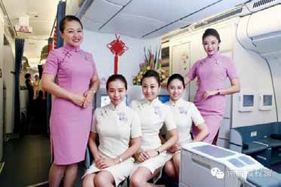 南航客艙部挑選15名精英乘務員執飛廣州 ─長沙─法蘭克福首航,全體乘務組成員身著旗袍,為旅客留下了美好印象。