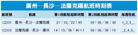 「廣州─長沙─法蘭克福」去程航班每週一、三、五,21:30從廣州起飛, 22:45到達長沙,第2天00:05從長沙起飛,當天06:00到達法蘭克福。回程航班每週二、四、六,14:15從法蘭克福起飛,第 2天早晨06:45到達長沙,08:00從長沙起飛,09:15到達廣州(以上時間均為當地時間)。