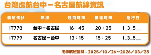 目前航線規劃以每週3班營運,週一、三、五飛行,班表橫跨秋、冬時節,甚至到明年春節檔期都擁有充足機位,可提供業者儘早掌握名古屋旅遊商機。而針對業者最關心的團體旅遊,台虎特別與燦星、旅天下共同合作,透過2家業者各別在台中的經營優勢,規劃相關優質特惠商品,歡迎同業致電洽詢。