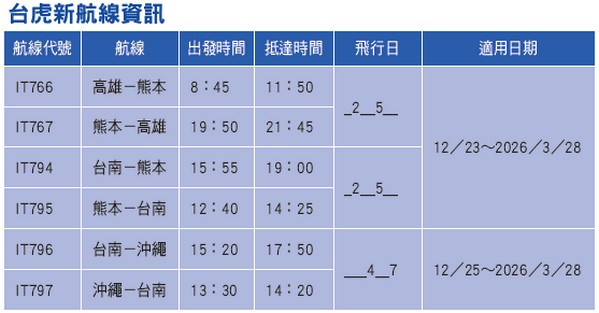 ▲台虎12月陸續開航「高雄-熊本」、「台南-熊本」和「台南-沖繩」等3條新航線。