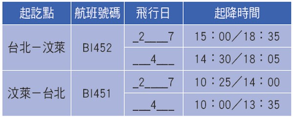 汶航為汶萊國營的航空公司,創立至 今已屆51年,至今已獲得多項國際航空 評鑑肯定,今年度更榮獲亞洲最佳客艙 服務團隊及東協清珍品牌大獎。搭乘汶 航自汶萊出發共可銜接22座國際城市, 台北-汶萊則於每週二、四、日飛航, 僅需3小時35分即可直抵汶萊,藉由汶航 可靈活搭配4~6天的產品,亦可經汶萊 轉機前往古晉、沙巴、泗水、雅加達、 杜拜、墨爾本、清奈等團體行程。航班 以A320neo執飛,別於一般航空同機型多 劃分為180席,汶航涵蓋12席商務艙共劃 分成150席次,給予旅客更舒適的飛行體 驗。此外,今年6/23起對台灣開啟免簽 停留汶萊14天的政策,旅客僅需於出發 前填寫入境單與健康聲明表即可,大幅加 速旅客入境手續。