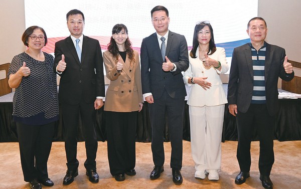 ▲(左起)甲聯會會會長王丹鳳、旅行公會總會理事長吳盈良、海峽兩岸旅遊交流協會台北辦事處主任何婕、中國東方航空台灣分公司總經理支勇、台北市旅行公會理事長陳怡璇、基隆市旅行公會理事長王壽山。