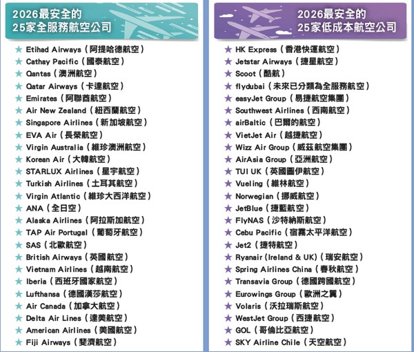 Safest Airlines)」,從全球超過320家航空公司中評選出最安全的航空公司。