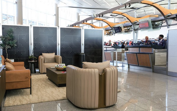▲位於亞特蘭大哈茲菲爾德傑克遜國際機場(ATL)國際航廈的「達美至臻商務艙專屬登機報到」空間,結合報到櫃檯與休憩區域設計。