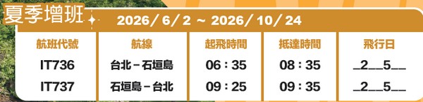 台灣虎航營業發展部實體通路組組長楊栢源表示,石垣島地理位置優異,透過台虎的直飛航班僅需1小時便能抵達,是台灣旅客最接近日本的一次。而從去年7月∼10月的航線裝載率來看,平均載客率超過9成,是近期旅客訪日的熱門首選。因此,持續看好今年市場發展,台虎從2/4開始,規畫每週2班的飛行(週三、六),並預計在6/2起增班至每週4班(週二、三、五、六),為暑假及家庭旅遊市場提供更高彈性。