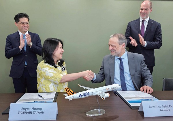 ▲台灣虎航董事長黃世惠(左2)及營運長賴俊廸(左1)特別前往新加坡航空展,與空中巴士進行簽約儀式