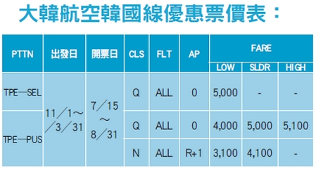 大韓航空推出韓國線優惠促銷價格,敬請多加利用!提醒您1B系統若價格內建TOURCODE(PVFARE),勿再下折扣,依照系統內建為主。若為公開票價(PBFARE)皆可依照KP規定拿折扣。新價格已於系統建置完成,產品上架前請確認訂位系統票規等資訊。