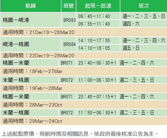 長榮航空繼7/25開放銷售新航線「桃園-峴港」之後,即日起開賣明年2月正式開航的線路「桃園-米蘭」,預計明年2/18開航,採用機型77B(353席)或機型77M(323席)。「桃園-峴港」慶祝開航推出首7班(21DEC19~27DEC19)開航促銷價,峴港年度票價亦可與東南亞航點交叉使用。詳細航班資訊,請以GDS系統提供為主,敬請同業週知並多加利用,航班訊息如下: