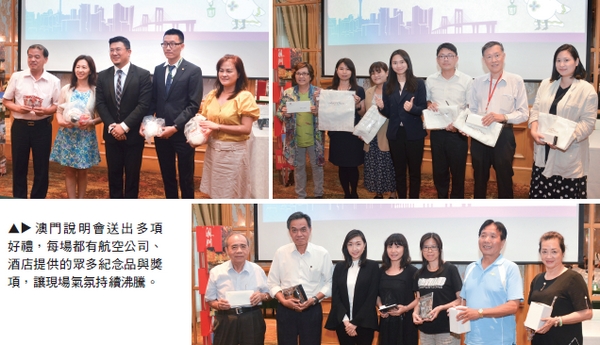 為了讓同業更加了解澳門市場的最新近況,澳門旅遊局特別於8/5、8/6、8/7分別在台北、台中、高雄舉辦旅行業者說明會,由澳門旅遊局公關顧問林鴻祥親自主持,包括澳門美高梅酒店、銀河娛樂集團、澳門大倉酒店等酒店代表也都特別抵台與會,與北中南業者面對面溝通、推廣。總計台北、台中、高雄3場吸引超過300位旅遊同業蒞臨,不難看出台灣旅遊產業對於澳門的喜愛程度。