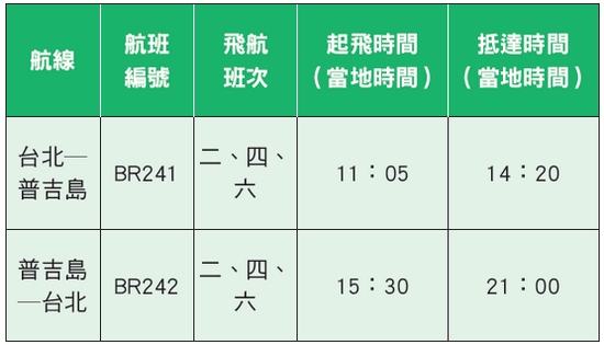長榮航空宣布,2020/4/2開闢台北─普吉島航線,提供每週3班的飛航服務,為台灣唯一直飛普吉島的航空公司,由台北出發前往普吉島往返時間將可大幅節省至少6個小時以上,無論背包客個人旅遊或是旅行社的團體行程安排,均可更為彈性。長榮航空台北-普吉島航線將以空中巴士A330-200機型飛航,機上配置有24個商務艙座位、228個經濟艙座位,共252席,慶開航,往返台北─普吉島最低只要7,400元起;同時也將與旅行業者共同包裝5天4夜及6天5夜的各式團體行程。