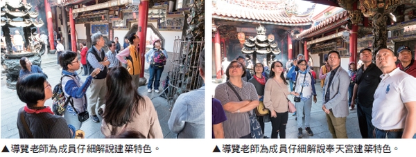 導覽老師分別帶領成員參觀奉天宮內外及各殿,除仔細講解建築、雕塑、彩繪等等民俗藝術特色,更一一解說了媽祖信仰以及廟中供奉道教各神明典故歷史及參拜方式,成員莫不表示收穫良多,更表示由於奉天宮是大甲媽祖遶境終點,對於此次媽祖遊程設計上更加有信心,也期待來年能實際設計參與媽祖遶境遊程,讓本次考察能有實踐機會。