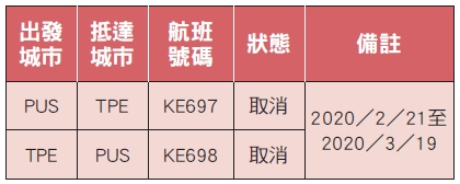 同時,大韓航空於2/21起至3/19止,取消桃園―釜山來回之KE697/8航班。已開立機票之旅客,請來電查詢替代行程並更改機票(RE-ISSUE)。另外,大韓航空將免收因航班取消產生的改票及退票罰金,敬請公告週知。