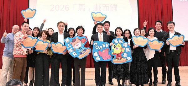 ▲(前排左3起)長汎假期產品副總經理王寶明、產銷副總經理蔡錦惠、董事長葉時忠、副總經理曾麗鴒與主管們攜手祝賀同仁馬年「馬」載而歸。