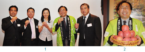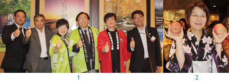 1.青森縣長三村申吾(右2)與日本航空台北支店長多田利郎(右1)、(左起)全日空台北支店長島一範、中華航空台北分公司客運營業部經理李宜州、復興航空經理陳玟玲合影。 2.青森縣長三村申吾熱愛台灣,每年都會來台宣傳青森蘋果的美味和觀光。