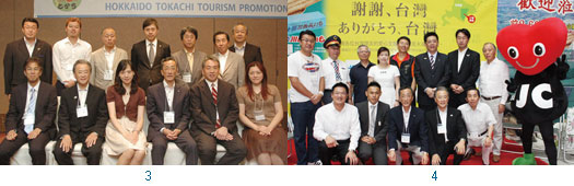3.(前排左起)日本航空台北營業處旅客業務部部長山戶博司、十勝觀光聯盟會長大友俊雄、長榮航空客運本部營業部歐澳東北亞課課長倪采繁、北海道帶廣市副市長本迫哲、日本航空台灣分公司總經理多田利郎、全日空台北支店營業部副理嚴冠玉與復興航空營運處客運營業部業務主任汪祥龍(後排左2)。4.(前排左起)國際青年商會中華民國總會常務監事張淵翔、日本交流協會台北事務所經濟部主任永野龍二、帶廣市副市長本迫哲、十勝觀光連盟會長大友俊雄、帶廣機場事務所專務取締役河合正廣;(後排左起)帶廣市商工會議所副會頭野村文吾、台灣鐵路局台北車站站長陳政詠、外交部亞東關係協會秘書長黃明朗、國際青年商會中華民國總會長呂幸儀、國際青年商會中華民國總會副總會長徐立信、北投國際青年商會會長李東柏、帶廣青年會議所理事長中村浩和、十勝川溫泉觀光協會會長林文昭(攝影>黃千珮)。