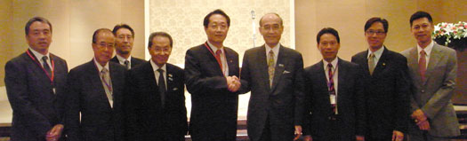▲(左起)日本航空台灣支店長多田利郎、台灣觀光協會副會長林清波、石川縣觀光交流局長蟹由尚、加賀屋代表取締役會長小田禎彦、長榮航空國際營業本部副總經理李士亮、石川縣長谷本正憲、交通部觀光局國際組組長江明清、長榮航空客運本部協理陳啟弘、中華航空台北分公司客運營業部日本線主任顏正哲。