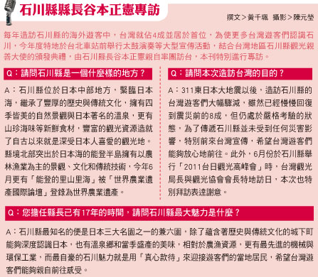 石川縣除了最著名的景點兼六園外,特別推薦日本唯一的千里濱渚海濱公路,全長8公里的沙灘道路,世界只有3處;七尾市的和倉溫泉更是北陸地區唯一的海之溫泉,也吸引許多溫泉愛好者前來朝聖。另外,今年6月在石川縣金澤市舉辦了「2011台日觀光高峰會」時,石川縣知事在會中表示希望能增加台灣飛往小松的航班,讓兩地的觀光交流更密切。在交通部和長榮航空協商下,預定自今年10 1起將長榮航空飛往小松的航班,從原本每週2班增加到每週4班,此消息不僅對於石川縣觀光推廣是個好消息,週邊的縣市也能同時受惠;當然增加航班對於業者在行程安排上也會更加便利、好操作。台日雙方也期待增加航班後,能夠更加促進兩地之間的觀光活動。