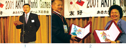 2. 日本世運參訪團長須田精一(左)與高雄市長陳菊互贈紀念品。 夜致詞。