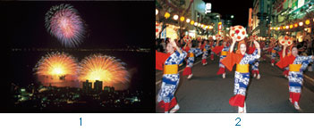 除了盂蘭盆會,最能代表日本夏天風情的莫過於各地舉辦的花火大會了!日本的花火大多都是在河岸旁施放,每年總會吸引不少觀光客的前來。歷史悠久的隅田川花火大會(7/31東京)與施放多達4萬發煙火的諏訪湖上花火大會(8/15長野諏訪市),最受觀光客們喜愛。