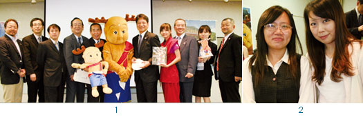 1.日本觀光協會台灣事務所所長井久保敏信(左4)、三重縣副縣長江畑賢治(左7)與團員、奈良的吉祥物「遷都君」(中)、三重縣的伊賀忍者(右4)等合影。