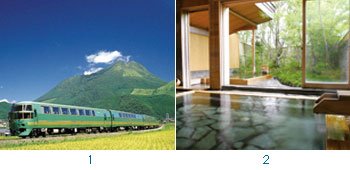 1.奔馳於綠野中的湯布院之森號,綠色車身彷彿與自然融為一體。
