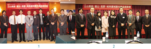 1.高雄場富山長野岐阜和立山黑部各地代表與日本航空高雄營業處處長松浦衛(左3)、經理邱精文(左4)、中華航空高雄分公司營業部商務組主任林家弘(左5)、長榮航空客運本部高雄辦事處團體課梁瑞驛(左6)合影。 2.台中場富山長野岐阜和立山黑部各地代表與長榮航空客運本部台中辦事處饒偉正(右4)、華信航空台中分公司營業組經理鄭春雪(左5)合影。