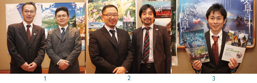 1 . 富山縣觀光課主管五十里榮(左)和主任村田英久。2 .長野縣觀光協會商品企劃部土屋孝夫(右)和上海代表處白鳥亘。3.岐阜縣觀光‧B R A N D振興課調查主任北村和弘。4.立山黑部貫光株式會社海外營業中心所長桔梗克彥。 5.黑部峽谷鐵道預約LEADER吉田守 (右)和松下隼己。
