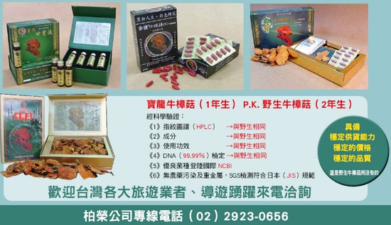 柏榮公司總經理蘇榮坤表示,柏榮公司是台大創新育成中心進駐廠商,獲經濟部中小企業開發新技術推動計畫(SBIR)「人工栽種牛樟芝於抗癌功效先期評估」通過審核,獲得85萬元研發經費補助;並獲國科會小產學「牛樟芝子實體抑制之鼠肝腫瘤之機能」通過審核,獲得48萬元經費補助。該公司開發的牛樟菇DNA 優良菌種證明登錄於NCBI;其重金屬與農業污染經公正單位檢測,符合國家標準規範;成份含量(附HPLC比對檢測)與野生雷同。