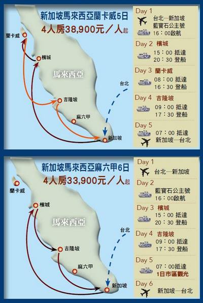 「2015年公主遊輪新加坡.馬來西亞」產品有5日、6日兩款,包裝4天3夜公主遊輪海上巡航與新加坡、馬來西亞陸上行程。使用酷航波音777機型,價格優惠卻仍享有舒適的空中乘坐體驗。其中,6日產品可享新加坡第1天半日遊與第5天整日遊,滿足親子、三五好友前進市區觀光,造訪伊麗莎白公園、One Fullerton、魚尾獅新家、濱海灣花園、濱海灣金沙娛樂城;於濱海灣欣賞夜間雷射燈光水舞秀,或可自費前往聖淘沙名勝世界—新加坡環球影城7大主題區,精心安排隨行導遊及交通,充裕時間更方便業者包裝,6日僅33,900元即可享有海、陸雙重樂趣。