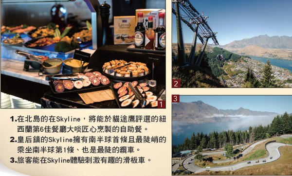 抵達南島皇后鎮(Queenstown)時,則能乘坐南半球首條且最陡峭的乘坐南半球第1條、也是最陡的纜車直達山頂,經典的皇后鎮明信片式景觀一覽無餘。除了廣受歡迎的高山景觀自助午餐與晚餐體驗,還可以暢玩滑板車,或參加觀星專案在夜空下感受皇后鎮的另一種浪漫。
