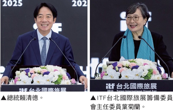 賴清德在致詞中指出,政府將設定 2030年達成觀光產值「兆元」的目標, 並成立專責研究單位,從產品開發與市 場研究著手,確立產業升級方向,以觀 光國家隊整合旅行業、觀光協會與各部 會能量,協助串聯縣市亮點活動,全面 提升旅宿服務品質,正面迎戰國際競 爭。同時,將以「北回之巔」、「微笑 南灣」作為2張名片,打響台灣國際品 牌。與民間攜手創造更高價值。ITF台 北國際旅展籌備委員會主任委員葉菊 蘭表示,ITF堪稱與ITB柏林旅展、WTM 倫敦旅展並列世界3大旅展之一,為亞太 地區重要的旅遊交流平台。今年展會規 模擴大,集結123個國家/城市、1,600 個攤位。她指出,台灣2024年出境旅遊 1,685萬人次、國旅2.2億旅次,整體旅 遊支出逾新台幣1.4兆元,展現強勁觀光 動能。